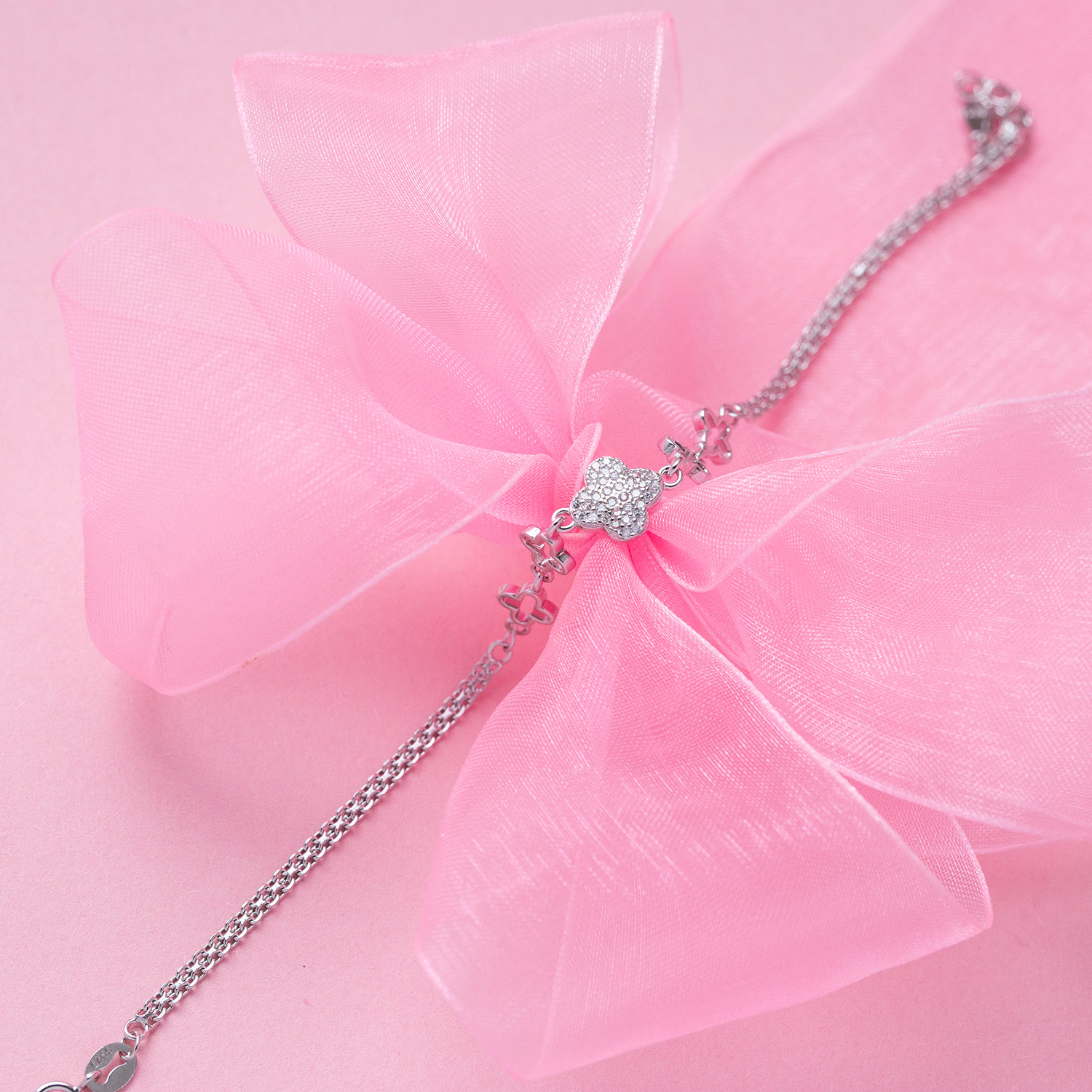 Wykonana ze srebra rodowanego z cyrkoniami w kolorze białym oraz ozdobnymi koniczynkami. Srebro próby 925.