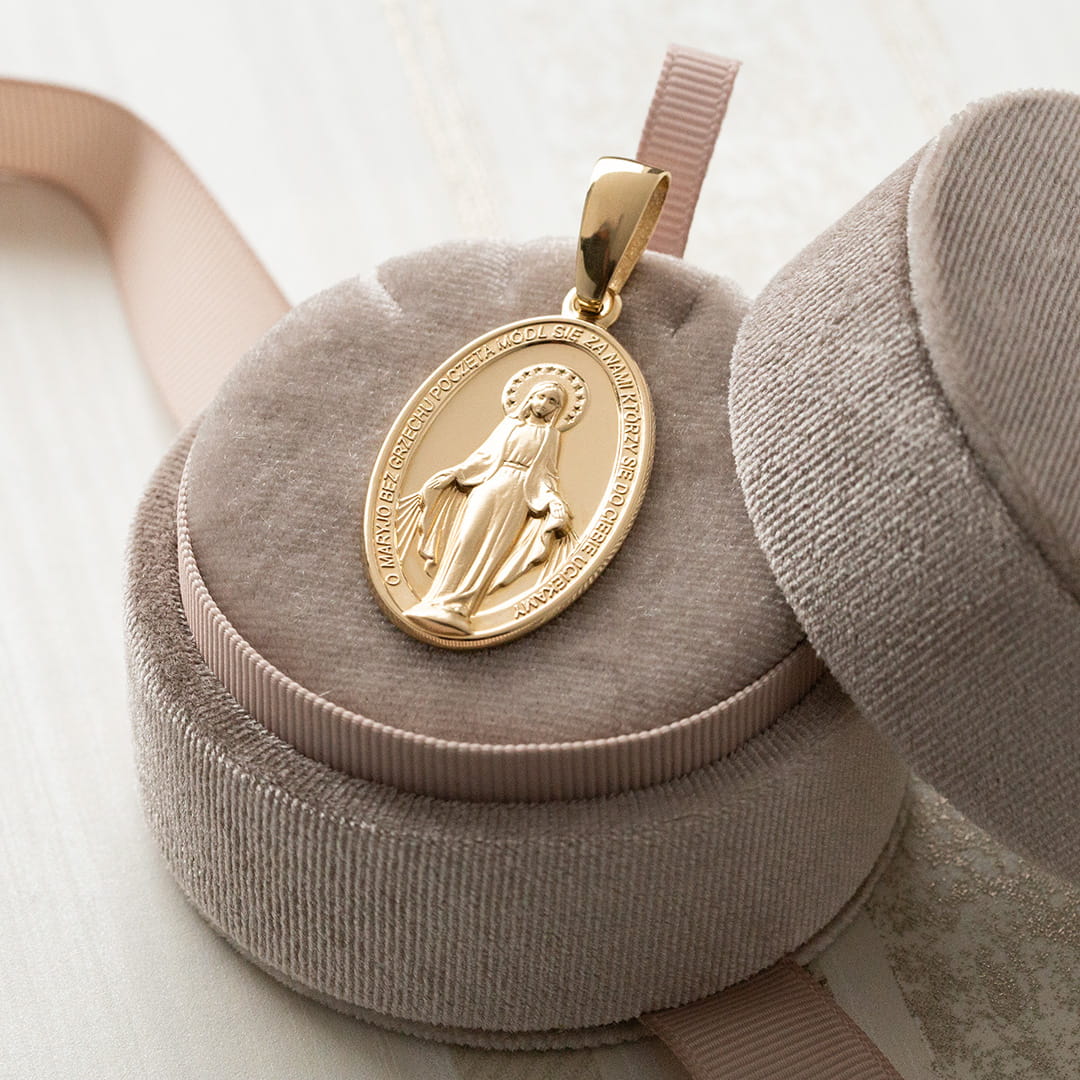 Duży medalik złoty z wizerunkiem Matki Boskiej Niepokalanej (Cudowny Medalion).