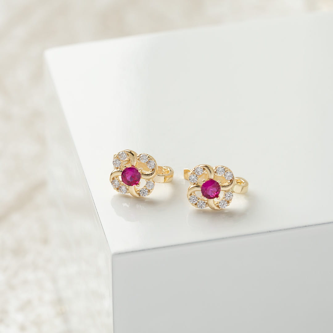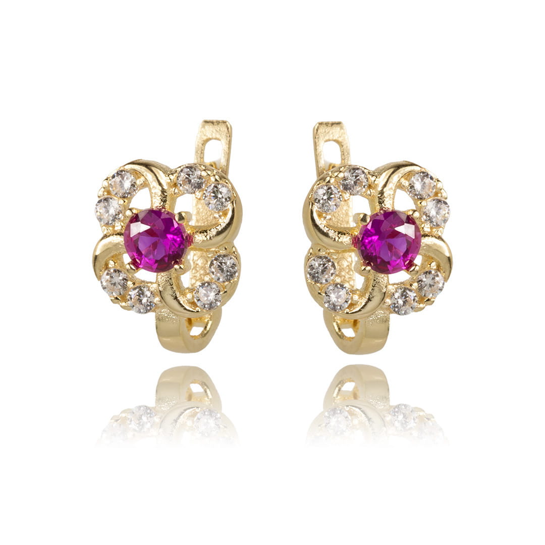 Kolczyki złote kwiatki z białymi i ciemnoróżowymi cyrkoniami