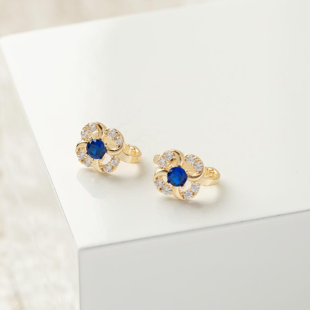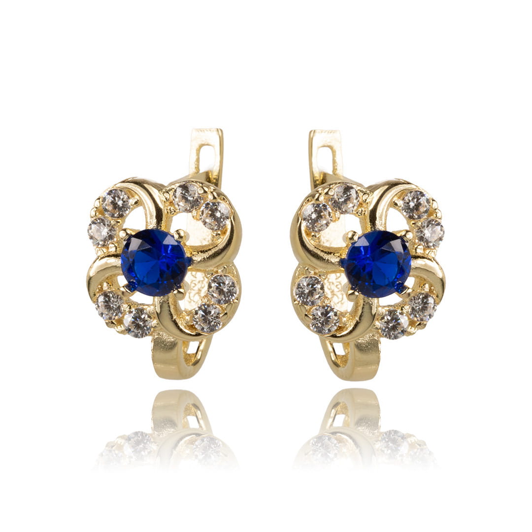 Kolczyki złote kwiatki z białymi oraz granatowymi cyrkoniami
