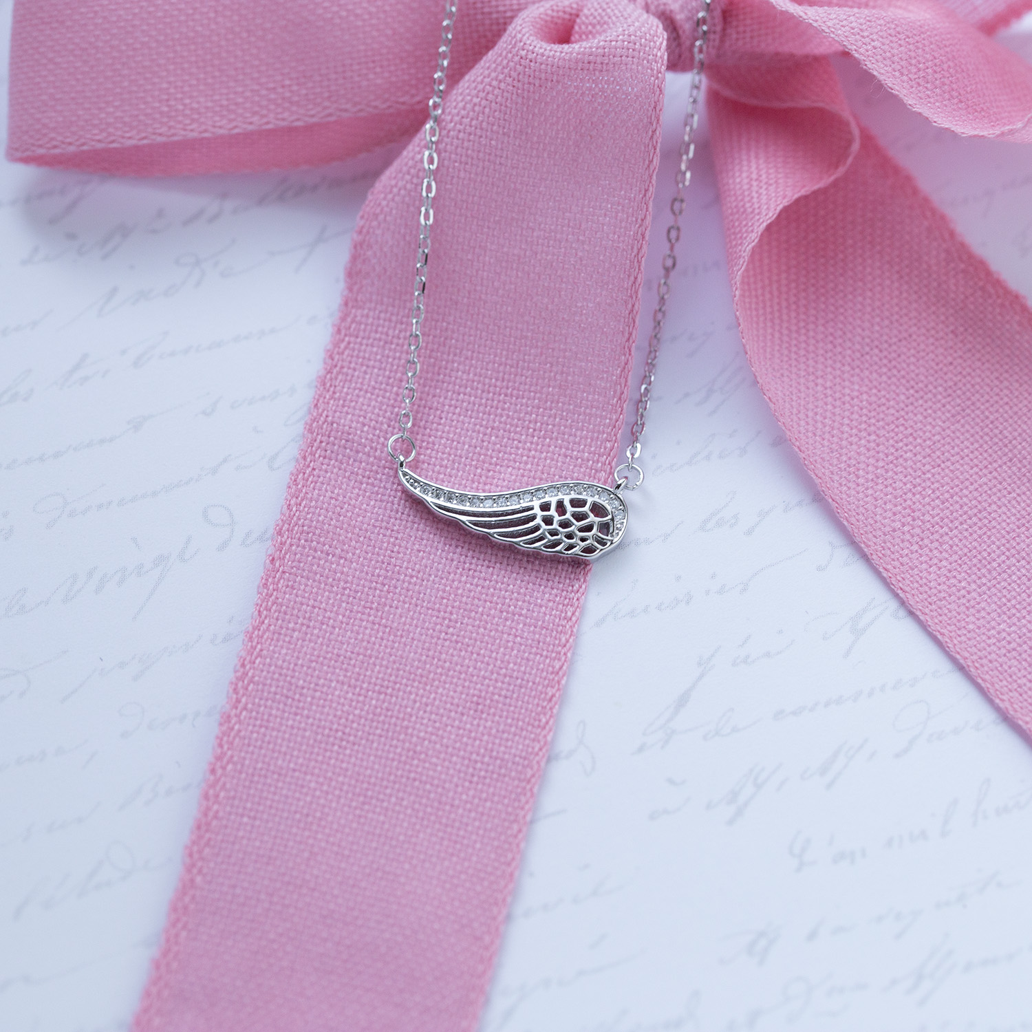 Naszyjnik srebrny rodowany z ozdobnym skrzydełkiem.