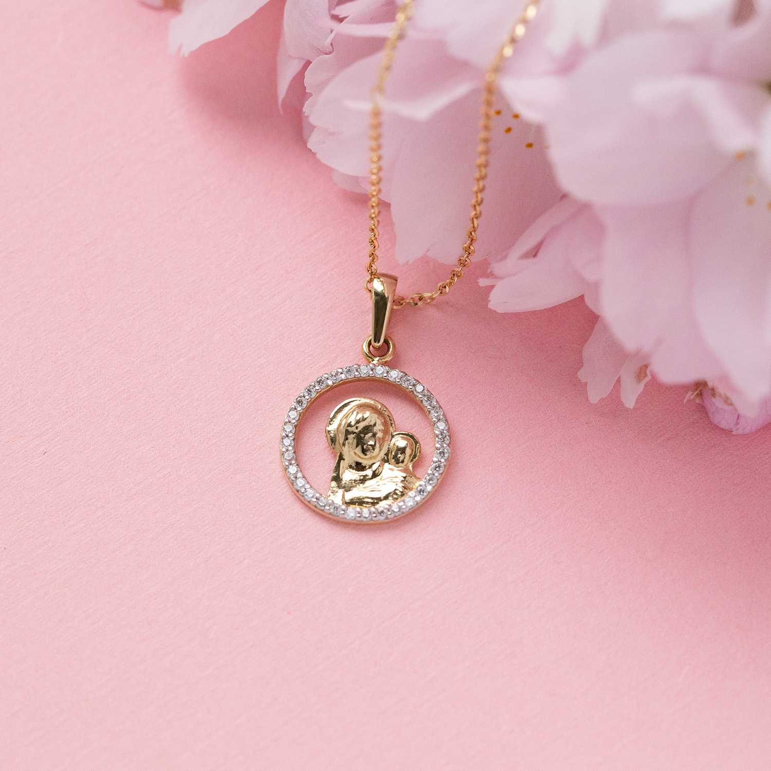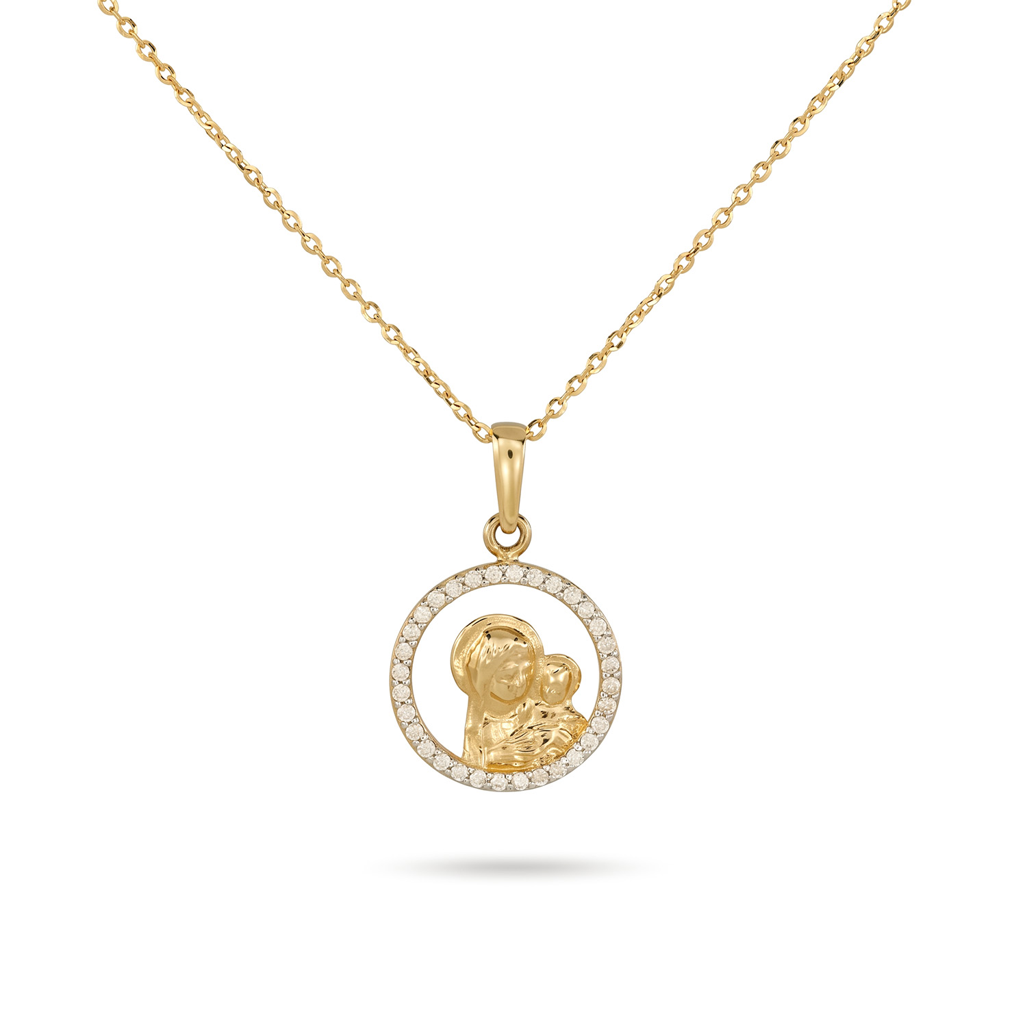 Złoty medalik Matka Boska z Dzieciątkiem i cyrkoniami