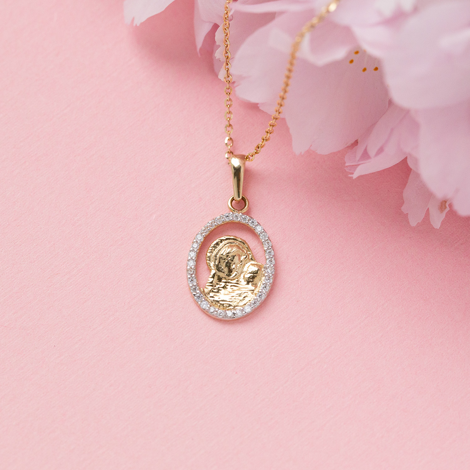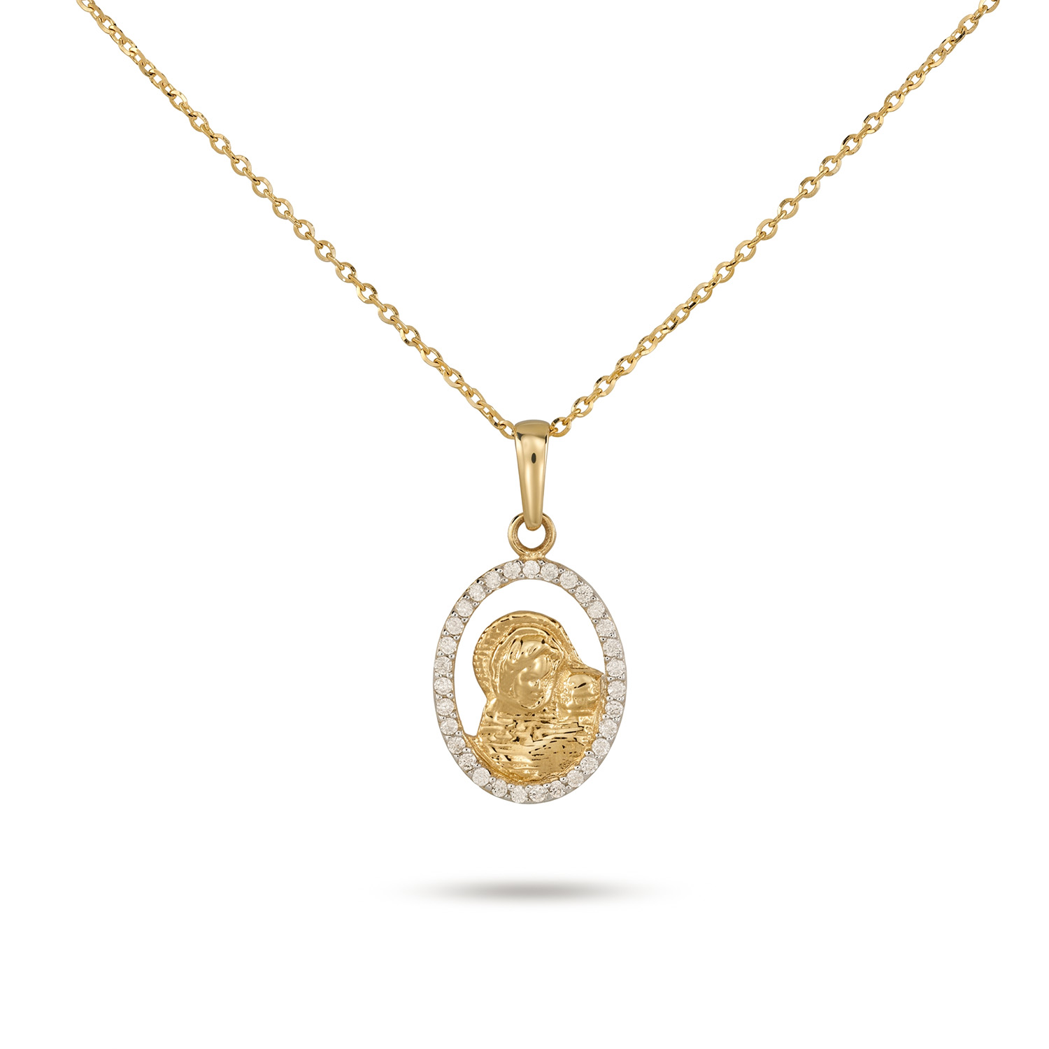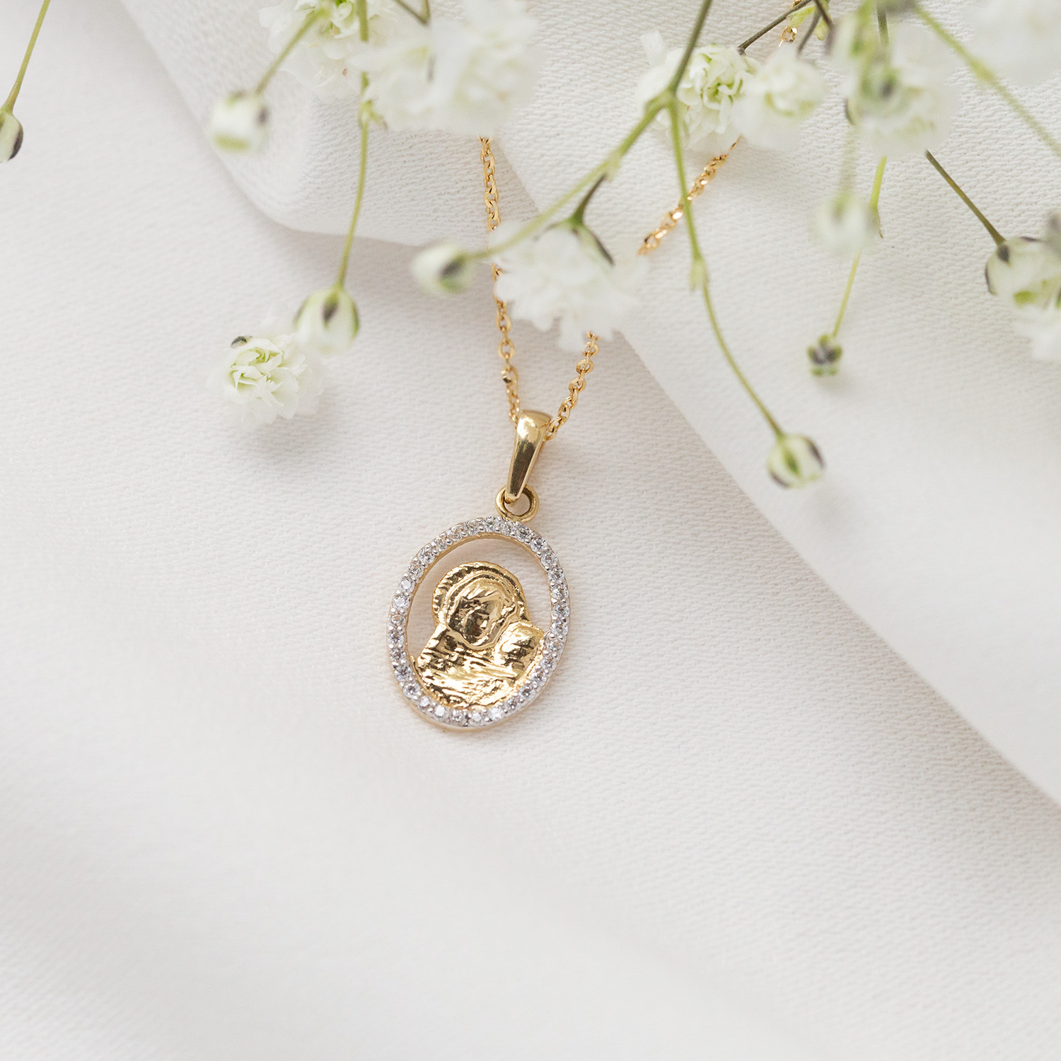 Złoty medalik Matka Boska z Dzieciątkiem i cyrkoniami